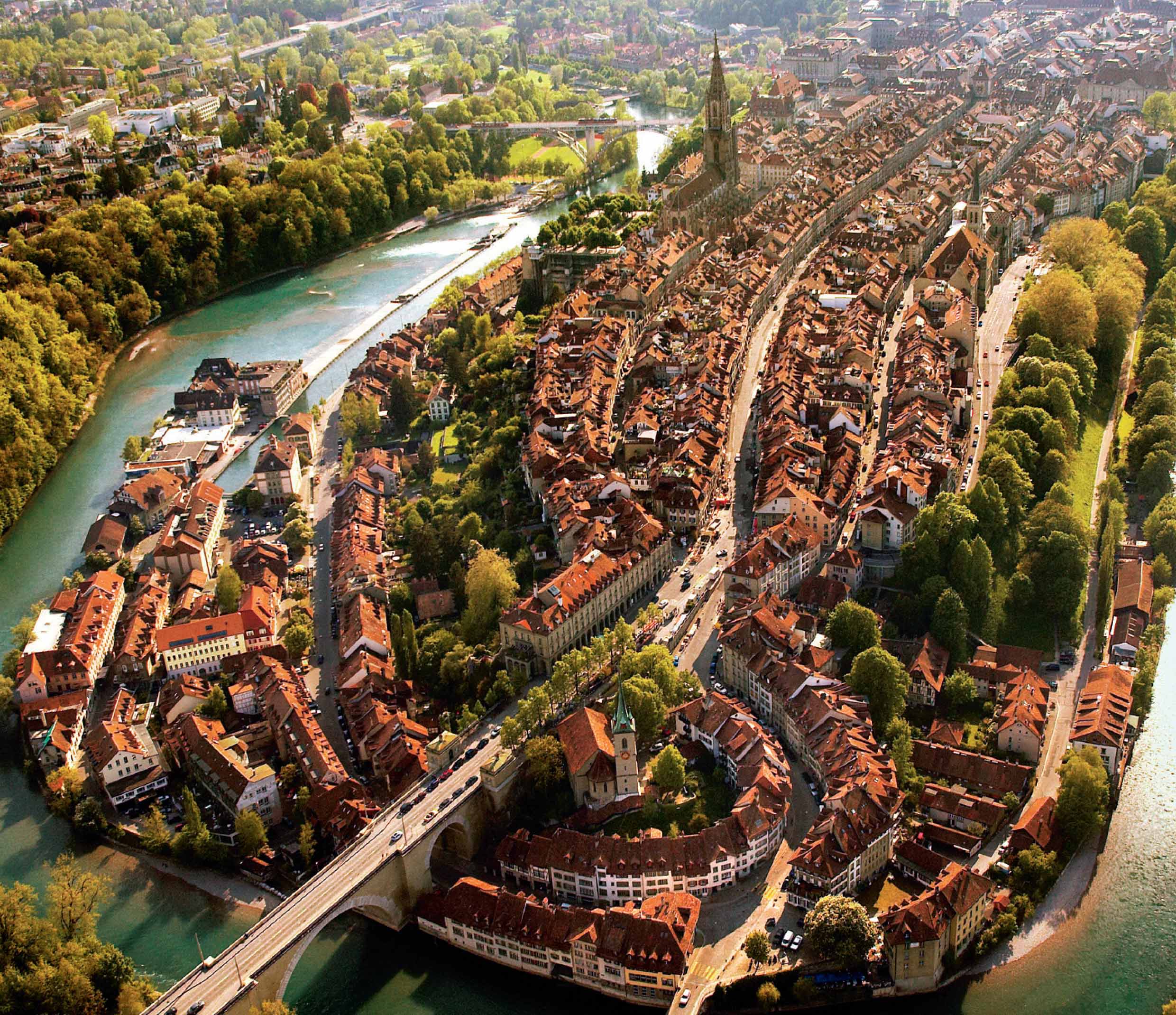 The jade green waters of the River Aare meander along three sides of the Old City of Bern, a picturesque and beautifully preserved example of a medieval town that has rightfully earned its place on the UNESCO World Heritage List. The city was founded in 1191 by the Zähringen family as a strategic stronghold. In those days the river served as a natural defence against invaders. Today, though, the River Aare serves as a refreshing recreational spot for the city’s residents during the summer months.