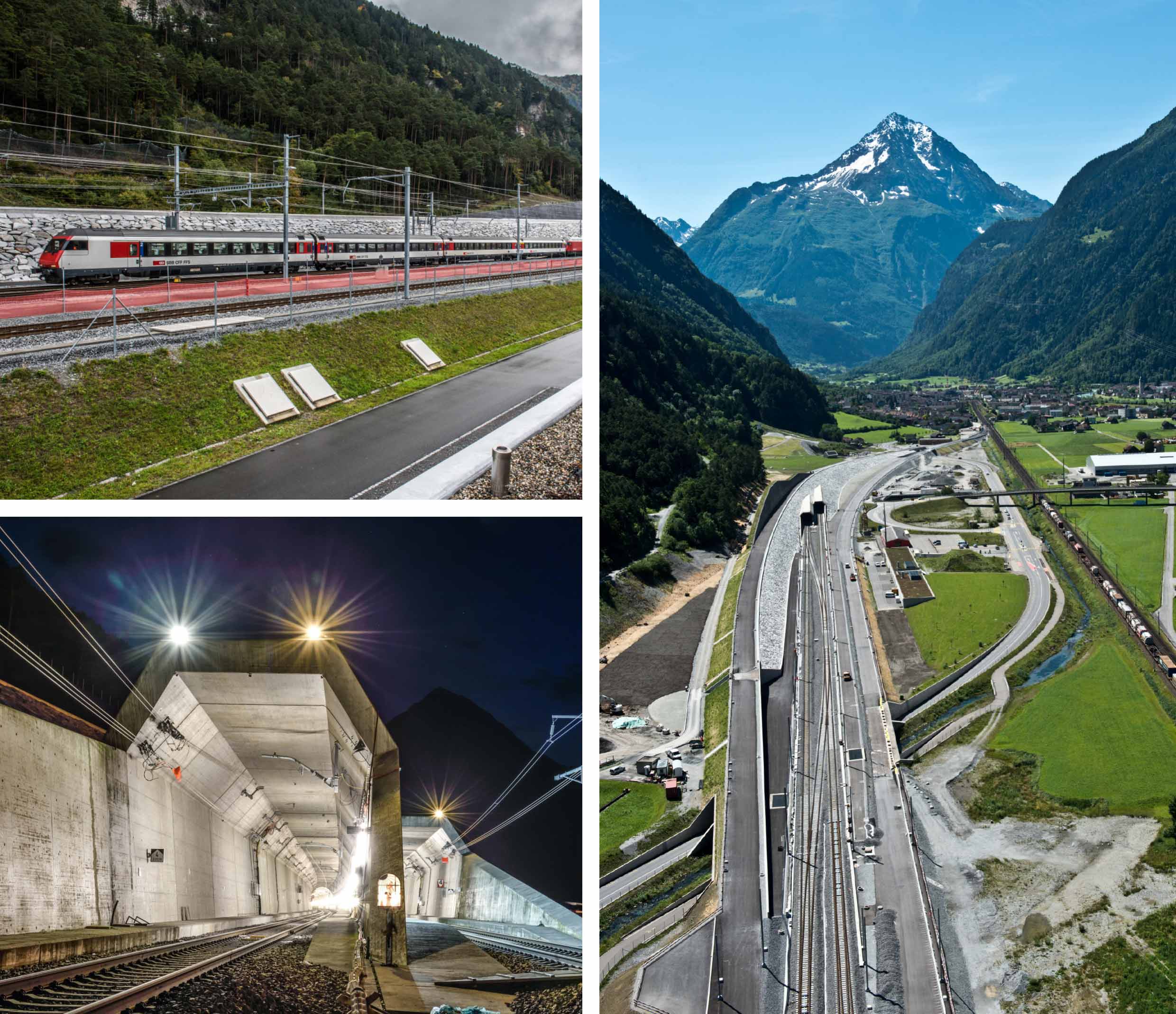 The first plans for a base tunnel between Amsteg and Bodio were drawn up in 1947. Just short of 70 years later and after a 17-year construction period, the Gotthard Base Tunnel replaces the Seikan Tunnel (53.9km) in Japan as the world’s longest railway tunnel. The breakthrough was made in October 2010. The Gotthard Base Tunnel cost around CHF 12.5 billion (around EUR 11.5 billion) and connects Bodio in the canton of Ticino with Erstfeld in the canton of Uri. The section of line through the Gotthard Base Tunnel is around 30 kilometres shorter than the previous line that ran over the mountain and, thanks to the new tunnel, capacity has been increased. Up to 250 freight trains and 65 passenger trains can use the tunnel per day. Capacity was restricted to a maximum of 180 freight trains on the previous Gotthard mountain line. Passenger trains can now travel through the tunnel at speeds of up to 200km/h, which will increase up to 250km/h in future.